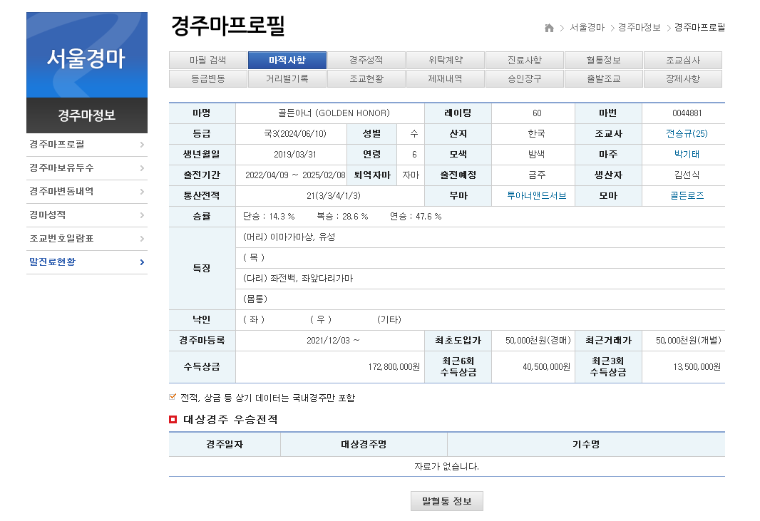 경마에서 가장 중요한 것은 경주마의 상태와 과거 성적이다. 한국마사회에서는 경주마의 다양한 정보를 제공하며, 이를 활용하면 보다 정확한 예측이 가능하다.