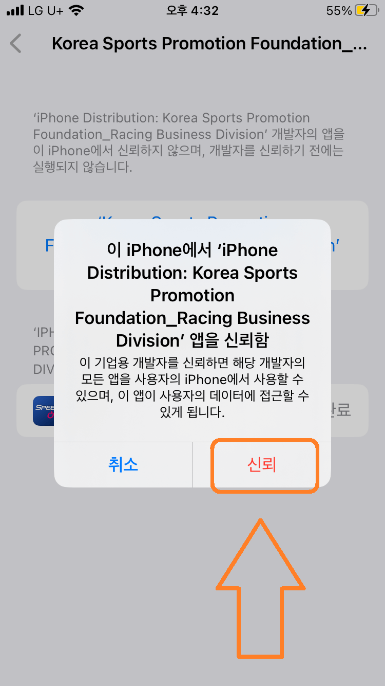 - <Korea Sports Promotion Foundation_Racing Business Division>를 신뢰하고 나면, 사용자 위치 허용에 대한 메시지가 나온다. 앱을 사용하는 동안 허용을 누르면 설치가 완료된다.