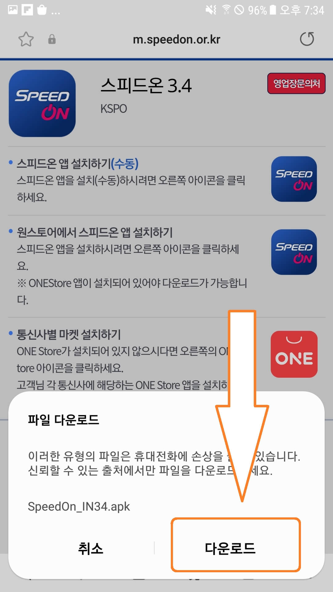 - 스피드온 앱 다운로드 링크로 이동 후에 '스피드온 앱 설치하기 터치' 그리고 파일 다운로드를 한다.