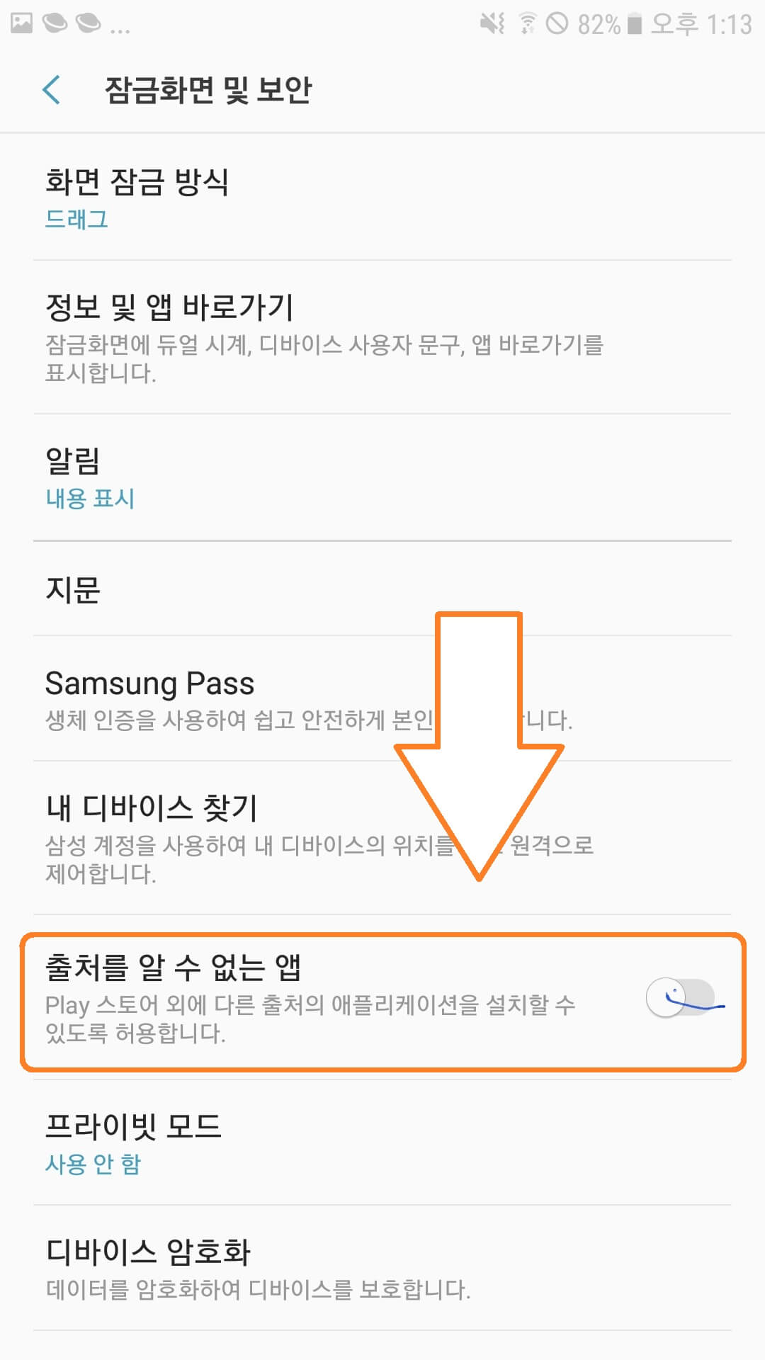 - 다운된 파일을 터치하면 보안 관련 메시지가 뜬다. 여기서 설정을 터치하여 '출처를 알 수 없는 앱 허용'을 하여야 한다.